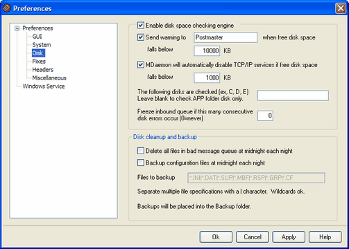 MDaemon will automatically disable TCP/IP services if free disk space falls below [xx] KB