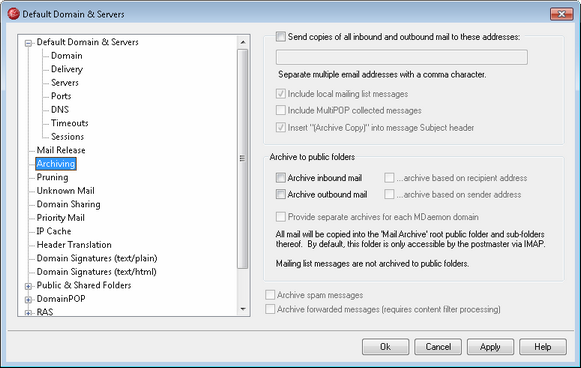 Click this check box to save a copy of all inbound messages into the Mail Archive root public folder and its subfolders. By default, this folder is accessible only by the Postmaster via IMAP. If you want to alter the permissions or grant access to more users you can do so by using the Access Control List reached from the Folder Listing screen of Public & Shared Folders.