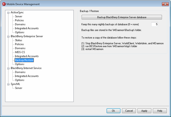 Each night the BlackBerry Enterprise Server database is backed up and the backup files are stored in the \MDaemon\Backup\ folder. This option determines the number of backup files that will be saved. When the limit is reached, the oldest file will be deleted when a new backup file is created. Use "0" in this option if you do not wish to do automatic nightly backups.