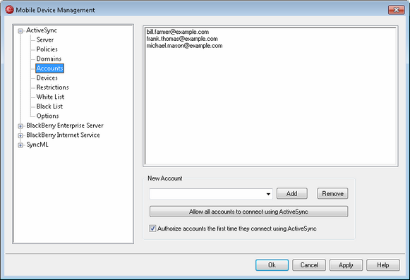 To manually authorize an account to use ActiveSync, choose the account from the New account drop-down list and click Add. To remove an account, select in from the list and click Remove.