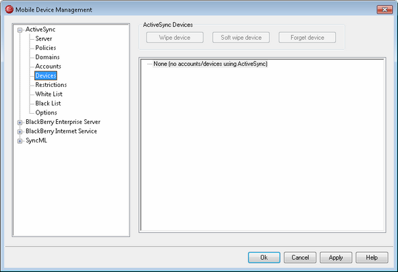 This screen contains an entry for each ActiveSync device associated with your system. Double-click any entry to see more details about the device.