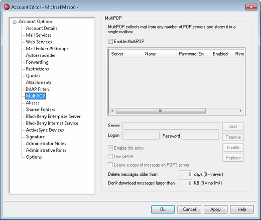 This is the number of days that a message can remain on the MultiPOP host before it will be deleted. Use “0” if you do not wish to delete older messages.