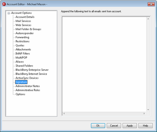 Use this screen to designate a signature that will be appended to the bottom of every email that the account sends. This signature is added in addition to any other signatures or footers added by other options, such as the signature option included in WorldClient and other mail clients, the Default and Domain signature options, and Mailing List footers. Default/Domain Signatures and Mailing List footers are always added below Account Signatures.