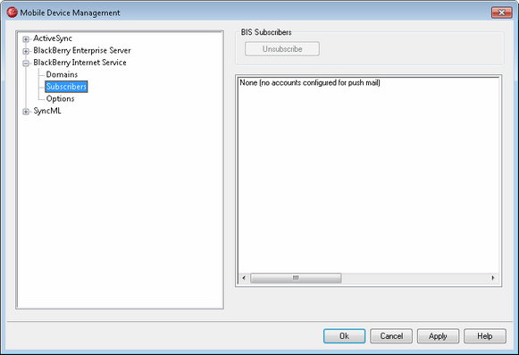 Unsubscribing from push mail can be done by deleting the email profile using the BlackBerry device itself. The BlackBerry Internet Service will then send MDaemon an UNSUBSCRIBE request and the account will be unlinked. The UNSUBSCRIBE request may take some time to arrive and this poses no operational issues.