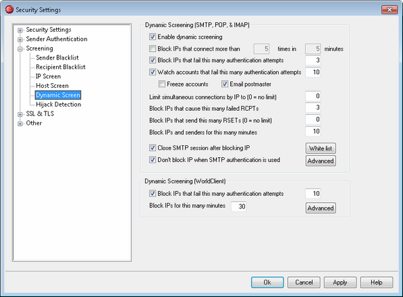 The "Dynamic screening (WorldClient)" section provides options that allow you to screen WorldClient connections.