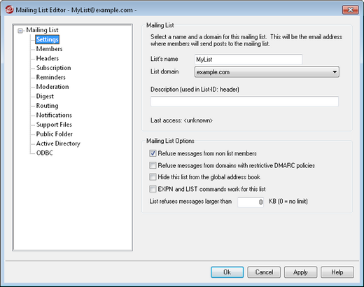 Enter a short description of your mailing list here if you wish to add it to the List-ID: header included in messages that are sent to the list. The description and the list's identifier will be included in the header (e.g. List-ID: "Frank's personal mailing list" <MyList.example.com>) Note that the list's identifier is the mailing list's address with "." substituted for "@" in order to comply with the List-ID specification. If you leave the Description option blank then the List-ID: header will contain only the list identifier (e.g. List-ID: <MyList.example.com>). If an incoming message addressed to the list has a preexisting List-ID: header, MDaemon will replace the old header with the appropriate one for the list.