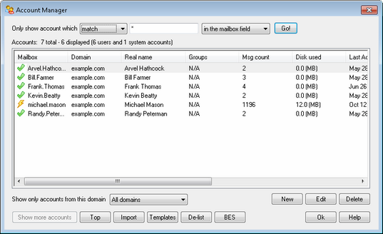 Above the list of accounts you will see two statistics regarding the list. The first number is the total number of MDaemon user accounts that currently exist on your system. The second number is the number of those accounts currently displayed in the list. The accounts that will be displayed is contingent upon what you have chosen in the Show only accounts from this domain option below the list. If you have selected "All Domains" then all of your MDaemon accounts will be displayed in the list. There is a search option at the top of this dialog that you can use to define exactly which accounts will be displayed beyond simply the domain to which they belong.