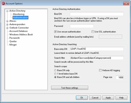 Click this checkbox if you wish to use secure authentication when performing your Active Directory searches. You cannot use this option when you are using a DN rather than a Windows logon in the Bind DN option above.