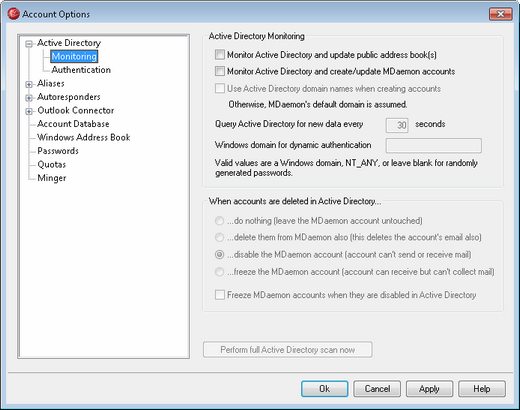 This is the interval at which MDaemon will monitor Active Directory for changes.