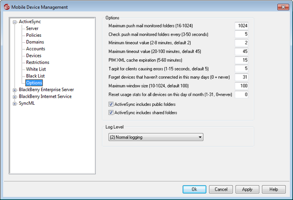 ActiveSync for MDaemon supports six levels of logging, from (1) Debug logging to (6) No logging. Generally (1) Debug logging should only be used to diagnose problems. The (2) Normal logging setting provides a good level of data and is the default setting.