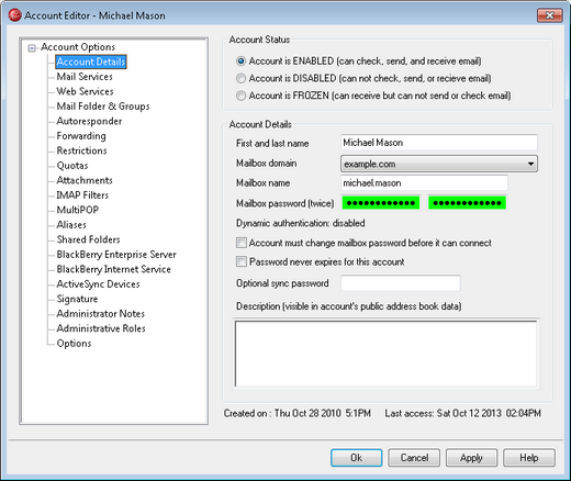 You should always provide a Mailbox password even if you do not wish to allow POP3/IMAP access to the mail account. In addition to mail session verification, the email address and Mailbox password values are used to allow remote account configuration and remote file retrieval. If you wish to prevent POP/IMAP access, use the options located on the Mail Services screen. If you wish to prevent all access, then use the Account is DISABLED or Account is FROZEN options above. |