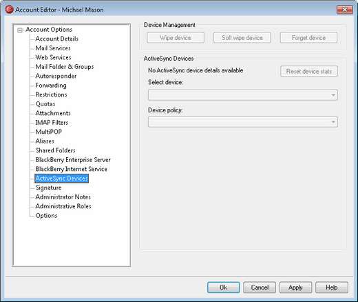 This screen displays information about any ActiveSync devices associated with the user's account. There are options for assigning ActiveSync Policies to the devices, for forgetting them, for remotely wiping them, and for resetting the device statistics within MDaemon.