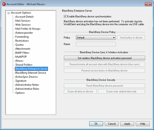 Click this checkbox to enable the account for BlackBerry device synchronization. BlackBerry enabled accounts appear on the BlackBerry Enterprise Server » Devices screen and can activate a BlackBerry device via USB cable in WorldClient or over the air (OTA) from the device itself (not all devices support OTA activation).