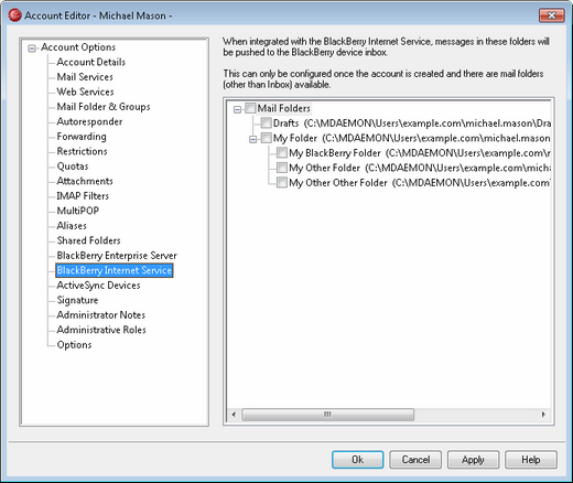 For users with access to WorldClient, the Folders page under Options in WorldClient contains this option so that users can manage the folder selection for themselves. This option, however, will only be available to them if the "Allow selection of non-Inbox folder content to send to BlackBerry" option on the BlackBerry Internet Service Options screen is enabled.