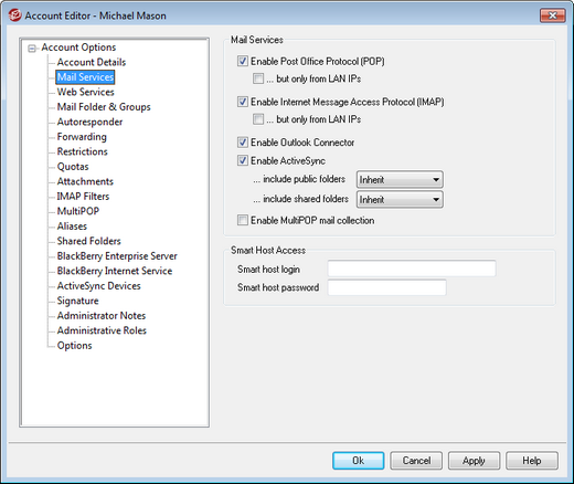 The options on this screen govern which mail services the account is allowed to use: POP, IMAP, ActiveSync, MultiPOP, and Outlook Connector. Email access via WorldClient is controlled from the Web Services screen. It also contains options for specifying optional Smart Host Access credentials for the account.