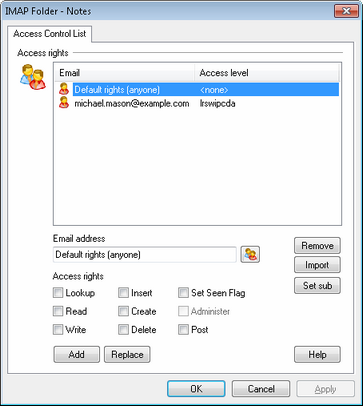 Access rights are controlled through MDaemon's support for Access Control Lists (ACL). ACL is an extension to the Internet Message Access Protocol (IMAP4), which makes it possible for you to create an access list for each of your IMAP message folders, thus granting access rights to your folders to other users who also have accounts on your mail server. If your email client doesn't support ACL you can still set the permissions via the controls on this dialog. ACL is fully discussed in RFC 2086, which can be viewed at: http://www.rfc-editor.org/rfc/rfc2086.txt. |