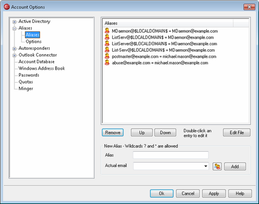 The Aliases options, located at Accounts » Account Options, make it possible for you to create alternate mailbox names for your accounts or mailing lists, which are useful when you want multiple mailbox names to resolve to a single user account or list. Without aliases you'd have to create separate user accounts for each address and then forward messages or use complicated filter rules to associate them with other accounts.