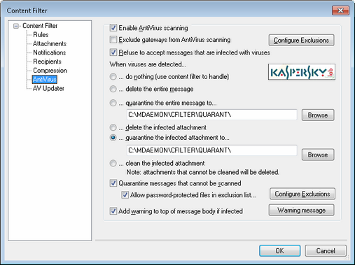 Choose this option and specify a location in the space provided if you want infected attachments to be quarantined to that location rather than deleted or cleaned. Like the "Delete the infected attachment" option, the message will still be delivered to the recipient but without the infected attachment.
