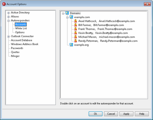This area lists all available local mailboxes that can host an autoresponder. Double-click an account in this list to open its corresponding Autoresponder screen, which is used to configure an autoresponder for that account.