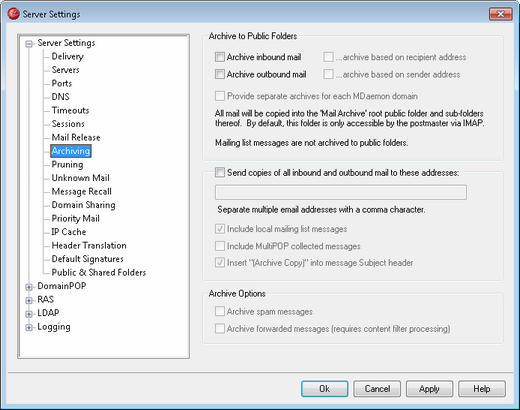 Click this check box to save a copy of all inbound messages into the Mail Archive root public folder and its subfolders. By default, this folder is accessible only by the Postmaster via IMAP. If you want to alter the permissions or grant access to more users you can do so by using the Access Control List.