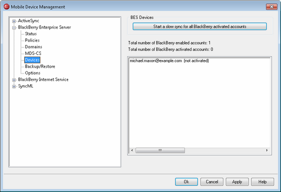 This screen lists all accounts that have been enabled for BlackBerry device synchronization, and their current state: activated or not activated. Activated accounts also display the activated device's PIN. Under the account list is a counter that tells you the number of accounts that are enabled for BlackBerry device synchronization and the number of accounts that are activated.