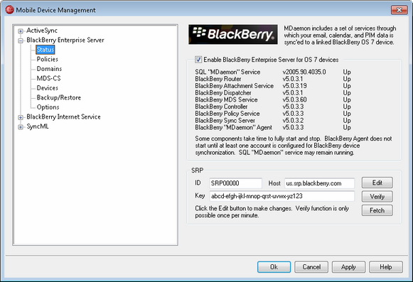 Server Routing Protocol (SRP) is used to authenticate and identify traffic between your MDaemon and your BlackBerry devices across the wireless network. This requires that your MDaemon have a unique SRP ID and SRP Key, which is obtained automatically during installation. Your SRP credentials are associated with your MDaemon server and cannot be used by any other server. You should not need to edit this information, but if it is necessary to do so then an Edit button is provided. You can also click Verify to confirm that your SRP credentials are valid.