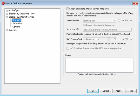 Check this box if you wish to enable MDaemon's BlackBerry Internet Service integration feature. You can then enable/disable it for individual domains by using the options below.