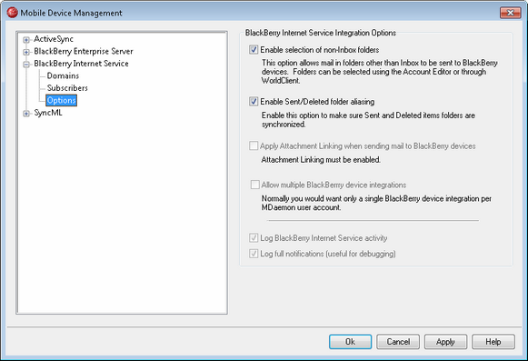 By default an internal folder aliasing scheme allows each user's "Sent Items" and "Deleted Items" folders to appear as values that the BlackBerry Internet Service recognizes, no matter what those folders are actually called in the user's account. This doesn't alter any folder names in any way. It is entirely an internal aliasing function to help ensure that sent and deleted messages are placed into the proper MDaemon folders. As with the above option, this option operates independently from the account integration options. It can be used even if the Enable BlackBerry Internet Service integration option is disabled on the Domains screen. If you do not wish to alias these folders for BlackBerry users, disable this option.