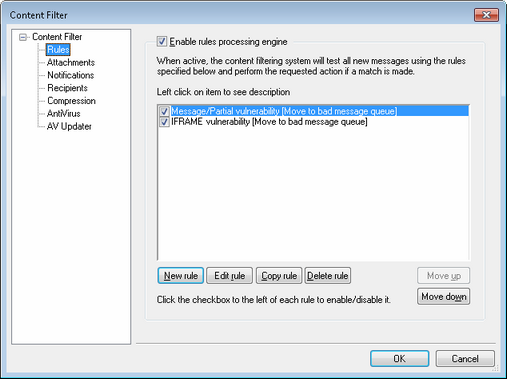 This box lists all of your Content Filter rules, with a checkbox beside each one so that you can enable/disable them at will. To see a description of any given rule in its internal script format, click that rule and pause your mouse-cursor over it (moving your mouse will cause the description to disappear). Whenever a message is processed through the Content Filter, these rules will be applied in the order in which they are listed. This makes it possible for you to arrange your rules to achieve a greater level of versatility.