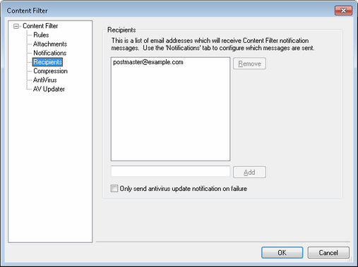 This list of recipients corresponds to the various "send...to administrator" options located on the Notifications tab. These addresses will receive notification messages when one of the Administrator options is selected on that tab. To add an address to this section, type it into the space provided and then click Add. To remove an address, select it from the list and then click Remove.