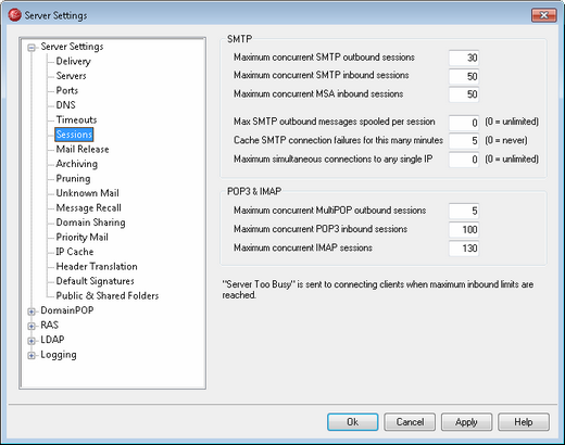 This value controls the maximum number of concurrent POP inbound mail sessions that the server will accept before it begins responding with a "Server Too Busy" message.