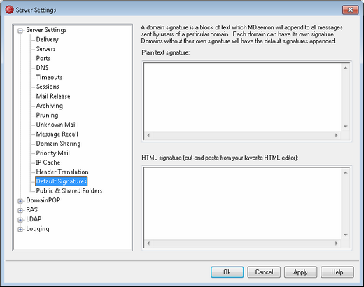 This area is for inserting a plain text signature. If you wish to designate a corresponding html signature to be used in the text/html part of multipart messages, use the HTML signature area below. If a signature is included in both places then MDaemon will use the appropriate one for each part of the multipart message. If no html signature is specified then the plain text signature will be used in both parts.