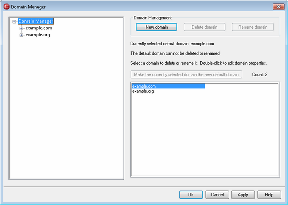 The area on the left side of this dialog contains the list of your domains, with links to each screen used for configuring the various domain-specific settings. The Default Domain is listed first and all other domains are listed alphabetically. The list on the right is used for deleting and renaming domains, and for designating the Default Domain. You can double-click a domain in this list to switch to the domain and configure its settings.