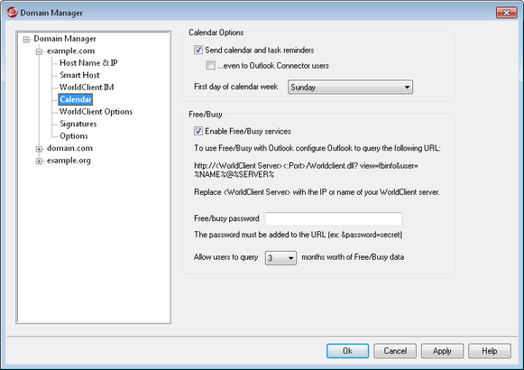 This screen controls MDaemon's Calendar features for this domain. The initial settings on this screen are determined by the Calendar screen located on the Web & IM Services dialog.