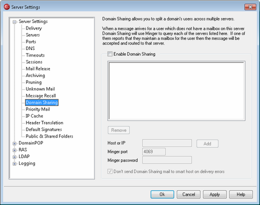 Check this box to enable Domain Sharing. After you have enabled Domain Sharing and added all of the Domain Sharing hosts or IP addresses to the list, ensure that you have also enabled and configured Minger so you can respond to queries from those hosts when they attempt to verify your local addresses.