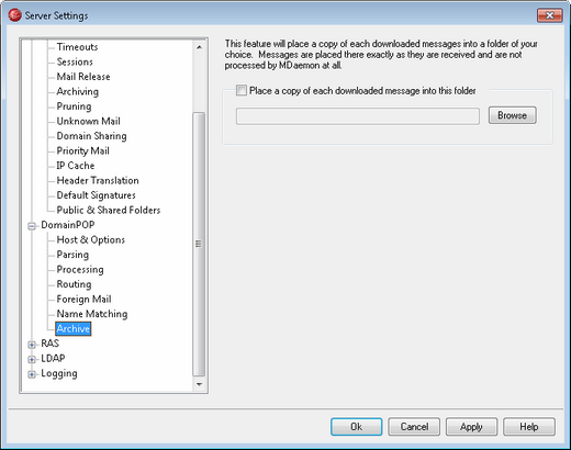 This is a safety feature to ensure that you don't lose any mail due to unforeseen parsing or other errors that might occur when downloading mail in bulk quantities. Check this box if you wish to save a copy of each downloaded message into the folder that you specify. These copies are placed in the folder exactly as they are received and are not processed by MDaemon at all.