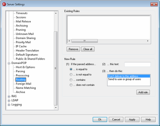 This is the type of comparison that will be made when an address is compared to this routing rule. MDaemon will search each address for the text contained in the "...this text" option below and then proceed based upon this option's setting — does the address's complete text match exactly, not match exactly, contain the text, or not contain it at all?