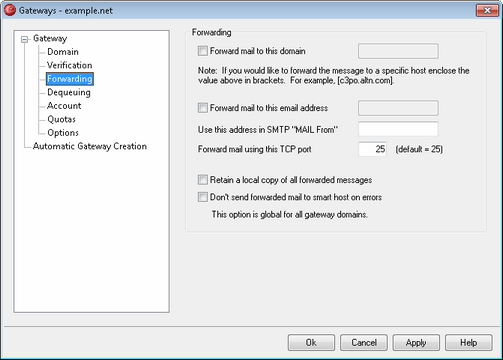 Sometimes it is advantageous to simply forward a copy of all messages for a domain as they arrive. If you wish to configure MDaemon to do this, enter the name or IP address of the domain to which copies of incoming mail for this domain should be sent. If you wish to forward the messages to a specific host then place the value in brackets (for example, [host1.example.net]).