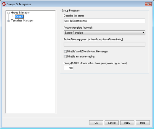 The Group Properties screen (Accounts » Groups & Templates... » [group name]) is used to configure the settings for each group you have created using the Group Manager. To open Group Properties from the Group Manager, double-click the group you wish to edit, or click the name of the group in the left pane. On this screen you can assign an Account Template to a group, allowing you to control a variety of account settings for group members. You can also link the group to an Active Directory group, control whether or not group members have access to WorldClient Instant Messenger (WCIM) and instant messaging, and set a priority level for the group. To control group membership, use the Group Manager and Mail Folder & Groups screen on the Account Editor.