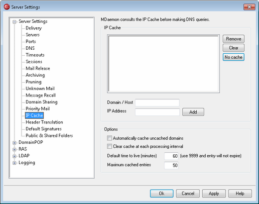 This option governs MDaemon's internal auto-caching engine. If you want MDaemon to cache domains automatically then enable this option. If you want to build the IP Cache yourself, then clear this checkbox.