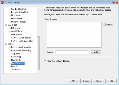 The domains listed here are considered by MDaemon to be part of your local LAN (local area network). Therefore, no dialup or Internet connection is required in order to deliver a message to one of them.