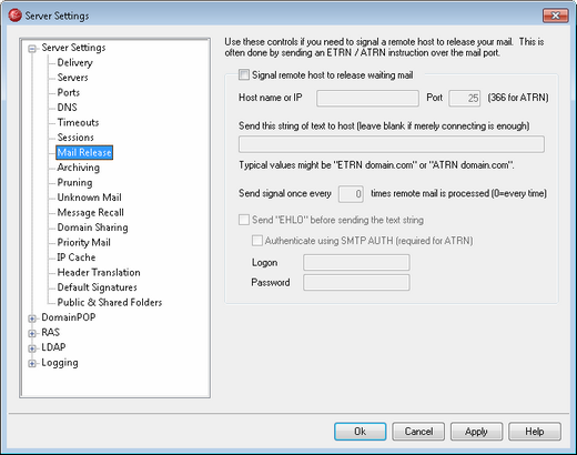 This control is for specifying the text string that needs to be sent in order for your mail to be released. For example, the ETRN method requires the text "ETRN" followed by the domain name of the site being queued. Other methods require different text to be sent. Consult your ISP if you need more information on what to send to unlock your mail queue. If you have a choice of the method to use, we recommend using On-Demand Mail Relay (ODMR) whenever possible. ODMR requires the ATRN command to be used in this option.