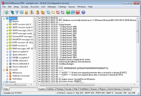 MDaemon's main graphical user interface (GUI) gives you important information regarding MDaemon's resources, statistics, active sessions, and queued mail waiting to be processed. It also contains options for easily activating/deactivating MDaemon's various servers. The GUI's tabbed panes keep you up to date on how the server and its incoming and outgoing connections are performing.
