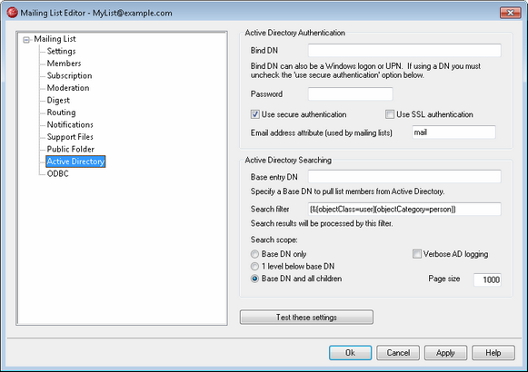 Click this checkbox if you wish to use secure authentication when performing your Active Directory searches. You cannot use this option when you are using a DN rather than a Windows logon in the Bind DN option above.