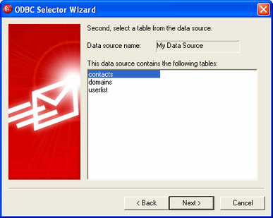 | 5. | The data source must contain at least one table with fields for email addresses and names. If the data source contains one or more qualifying tables, choose the desired table and click Next. Otherwise, click Cancel to exit the ODBC Selector Wizard and then use your database application to add a table to the relevant database before continuing. |
