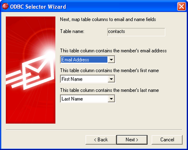 | 6. | Use the drop-down list boxes to designate the table fields that will correspond to email address, first name, and last name. Click Next. |