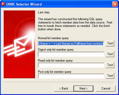 | 7. | The ODBC Selector Wizard will construct an SQL query statement based on your selections in Step 6. MDaemon will use it to retrieve normal list member data from your database. You can edit this statement as desired, and include other query statements in the remaining controls to cause members to receive messages in Digest mode, and to designate members as Read Only or Post Only. A Test button is provided beside each control so that you can test your query statements to make sure they retrieve the proper data. When you are finished configuring your query statements, click Next. |