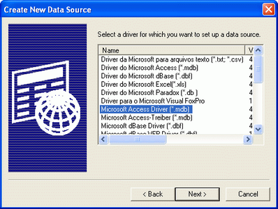 | 5. | Select the database driver for which you wish to set up the data source, and click Next. |