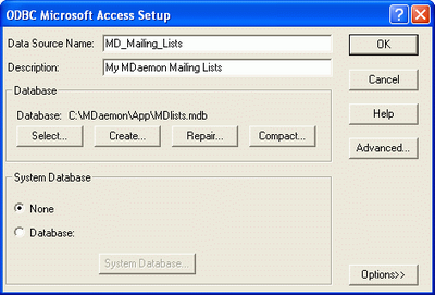 | 6. | Click Finish to display the driver-specific setup dialog. The appearance of this dialog will vary based on which driver you have selected (Microsoft Access Setup dialog shown below). |