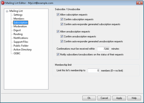 This option controls whether or not the list will allow subscription requests, either through specially formatted email messages or through autoresponders. For more information, see: Subscribing to Mailing Lists.